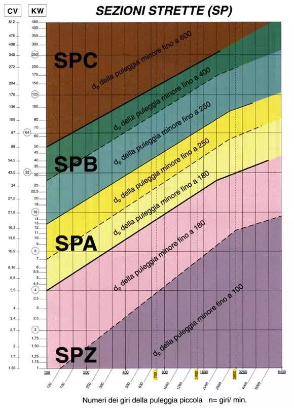 L'impiego del diagramma si rende necessario per eseguire la scelta della sezione più idonea a trasmettere una data potenza (P) espressa in KW o in CV in funzione del numero di giri della puleggia più piccola.