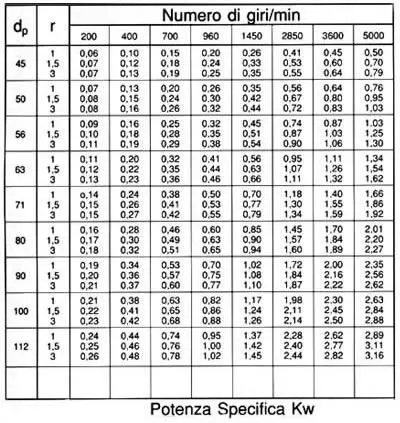 Tabella dei valori indicativi delle potenze specifiche Ps trasmissibili da ogni cinghia di lunghezza L = 800 mm. angolo di abbracciamento ß= 180° in funzione della velocita' di rotazione della puleggia piu' piccola in giri/min per alcuni rapporti di trasmissione.