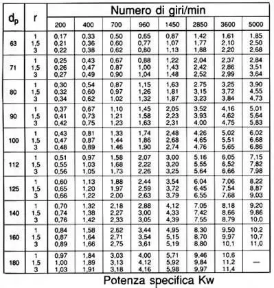 Tabella dei valori indicativi delle potenze specifiche Ps trasmissibili da ogni cinghia di lunghezza L = 1600 mm. angolo di abbracciamento ß= 180° in funzione della velocita' di rotazione della puleggia piu' piccola in giri/min per alcuni rapporti di trasmissione.