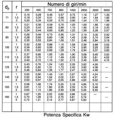 Tabella dei valori indicativi delle potenze specifiche Ps trasmissibili da ogni cinghia di lunghezza L = 1800 mm. angolo di abbracciamento ß= 180° in funzione della velocita' di rotazione della puleggia piu' piccola in giri/min per alcuni rapporti di trasmissione.