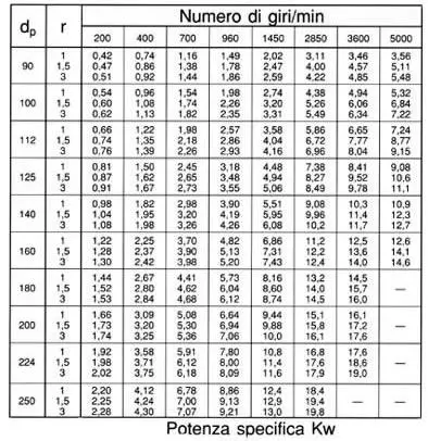 Tabella dei valori indicativi delle potenze specifiche Ps trasmissibili da ogni cinghia di lunghezza L = 2500 mm. angolo di abbracciamento ß= 180° in funzione della velocita' di rotazione della puleggia piu' piccola in giri/min per alcuni rapporti di trasmissione.